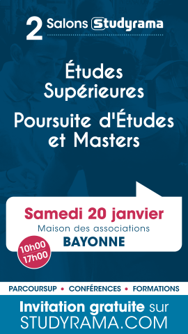 Éducation Salon Studyrama 20 janvier 10:00 - 17:00 Partager Pour obtenir votre invitation es_pem_bayonne_a5_q.pdf Fichier pdf 1.3 Mo
