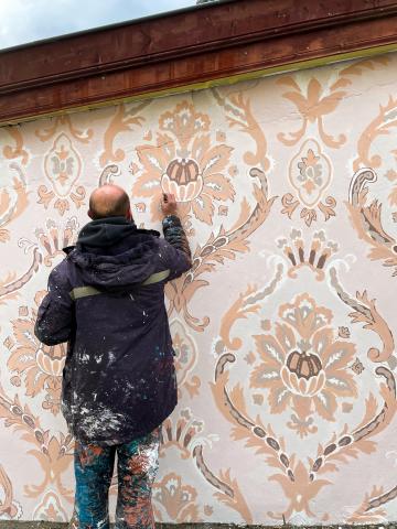 Toujours guidés par leur démarche de mettre en avant le patrimoine, la mémoire et la transmission à travers un travail sur les tapisseries, le duo a choisi de reproduire les motifs du papier peint, que le couple souhaite arracher, sur le mur extérieur de leur maison.