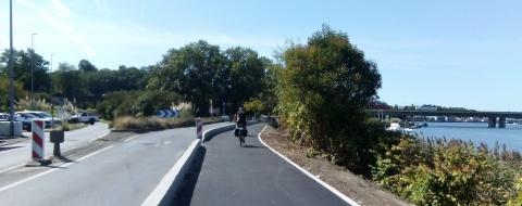 Dans l’attente du projet d’aménagement de la zone des Salines, le Département est dans l’obligation de mettre en place un passage provisoire. Il est étroit tant pour la circulation routière que pour les cyclistes et piétons sur 200m, avec une séparation par balises jaunes. Il devra rester jusqu’à la fin 2021 au minimum.
