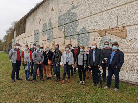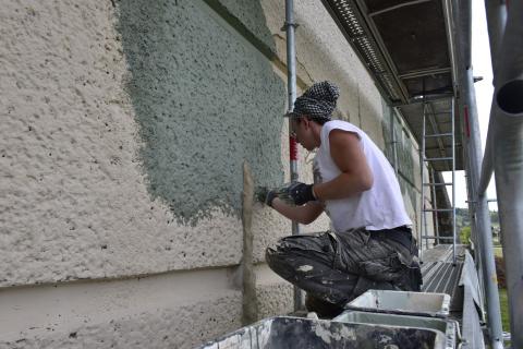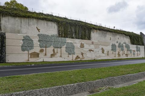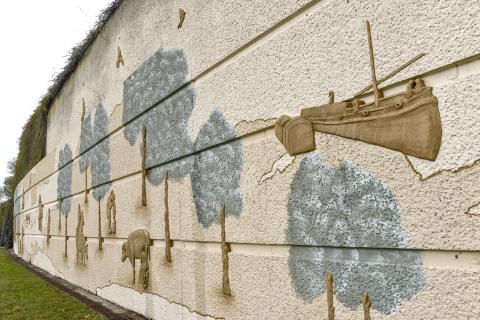 Bas-reliefs au ciment prompt, peinture silicate Mur 3,50m x 40,75m