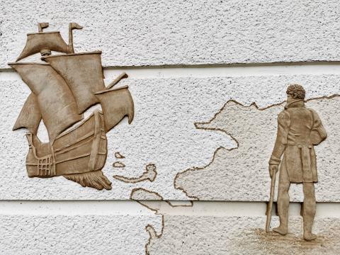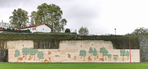 Situé sur un carrefour important, le décor conçu pour le rond-point d’Aïcirits évoque la diaspora basque vers le continent américain. Sur une carte stylisée rappelant les cartes de navigation anciennes, différentes illustrations rendent hommage à la vie et au travail des émigrés basques partis à différentes époques pour d’autres horizons. Des gravures (arbroglyphes) laissées par les bergers basques au cours du XIXe et XXe siècles dans les forêts d’Amérique du nord ont été reproduites sur les arbres réalisés en bas-reliefs de la fresque.